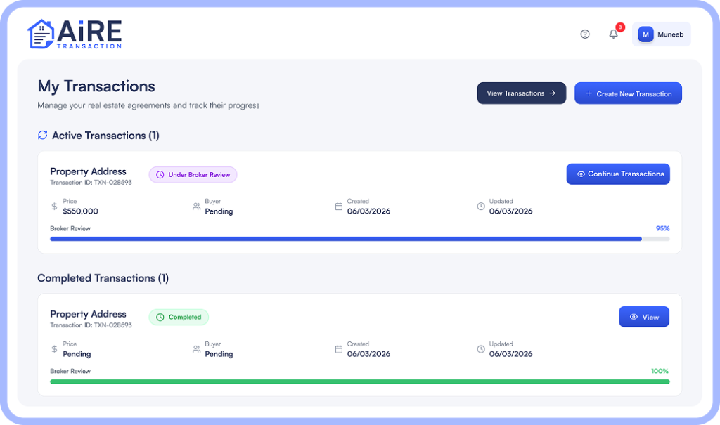 AiRE Transactions provides a structured, intelligent workspace designed specifically for residential resale contracts.